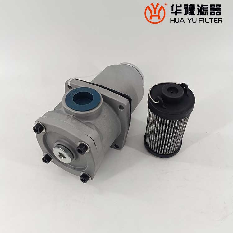 這種過濾器設有濾芯污染堵塞發訊器和油路旁通閥,當回油壓力達到0.35MPa時,發訊器發出開關信號或報警,還可直接從發訊器的表盤上讀出回油壓力值,以提示操作人員及時更換濾芯,保證系統油液的清潔度。更換濾芯只需旋開過濾器端蓋即可。當回油壓力上升至0.4MPa時,過濾器內的旁通閥便自動卸荷,以避免回油壓力過高造成整個系統工作