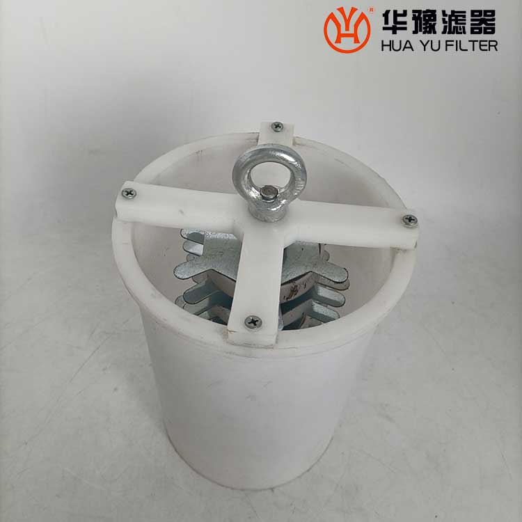 利用潤滑油自重狀態下的流動,經簡單的網過濾和磁場吸附,使污垢及時得以分離,磁網一體化裝置是由圓筒形過濾網(帶底座)和磁串組成,在潤滑油經該裝置落入油箱時,油液中直徑大于網目尺寸的污垢和一些鐵質微粒就會被阻擋于裝置內,從而達到分離的目的。